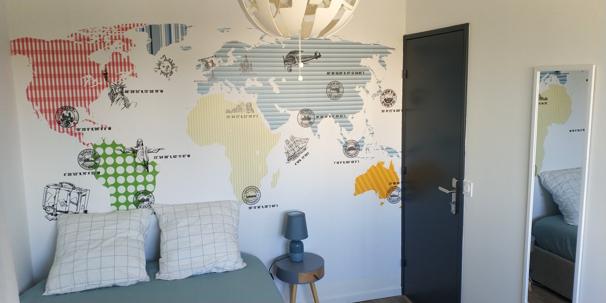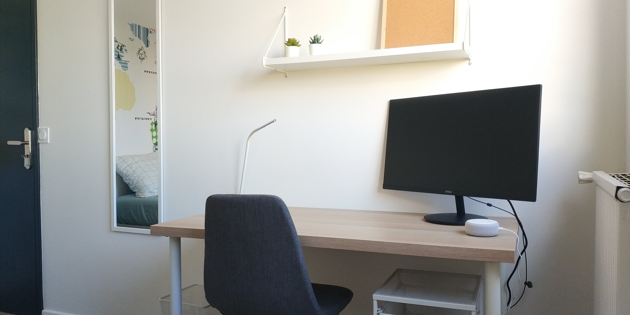 | Lit-coffre 140x190 | Bureau 120 cm | Ecran PC 27" | Chromecast TV | Echo Dot (Alexa) | Dressing 150 cm | Bibliothèque |