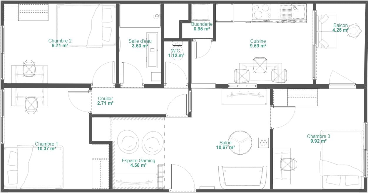 D'une superficie de 63 m², il dispose de 3 chambres d'environ 10 m², d'un salon, d'un espace gaming, d'une salle d'eau, d'une mini-buanderie et d'un balcon de 4 m² pour profiter de la vue dégagée. Une cave est également disponible au sous-sol.